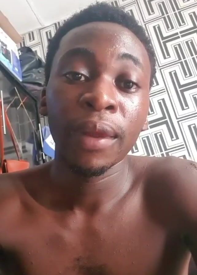 A shirtless, dark-skinned man with short hair is looking directly at the camera. He sticks out his tongue slightly, then runs his fingers through his hair. He rubs his face, and continues to look at the camera. The background features a patterned wall. A shelf with various objects is partially visible behind him.