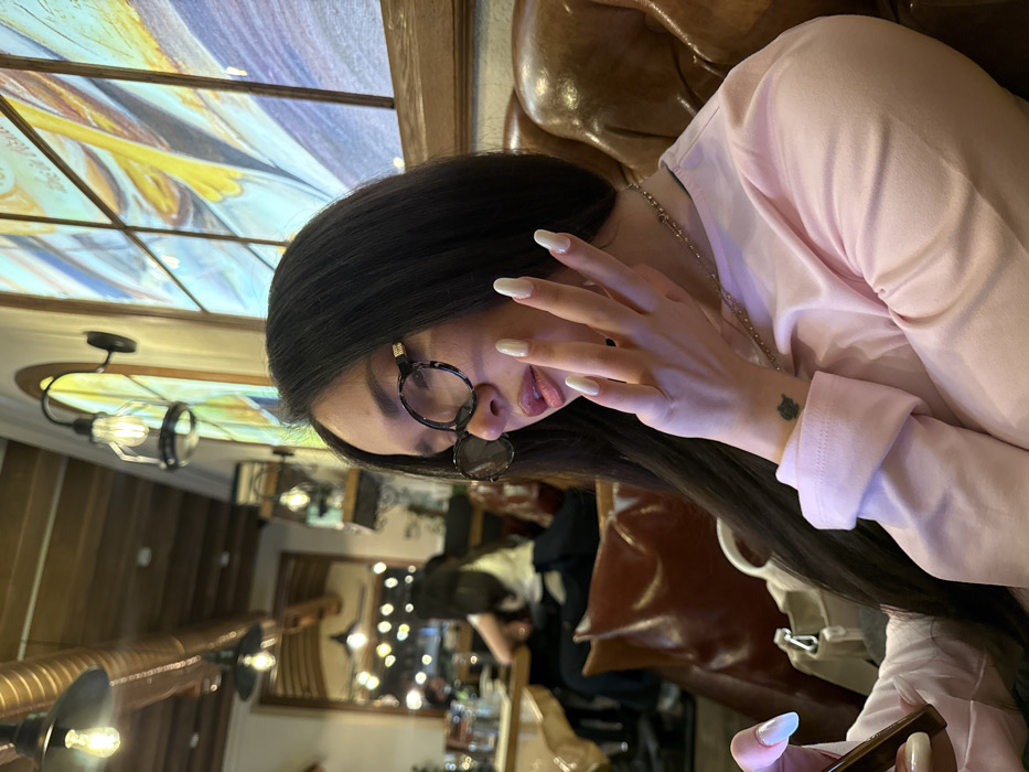 A woman with long, dark hair wears round glasses and a pink long-sleeved shirt. She holds a phone in one hand, showing long white nails. The other hand is raised near her face. A small tattoo is visible on her wrist. The background shows interior details: a stained glass window, industrial-style lights, and a seated person in the distance. The image has a slightly tilted perspective.