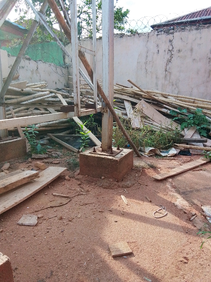 The image depicts a disorganized outdoor area in Agbor, Nigeria. A metal framework structure, possibly part of a building or antenna, is visible, attached to a square concrete base. The ground is reddish-brown soil, scattered with pieces of wood, including planks and bamboo segments. Patches of green vegetation are present, and a crumbling concrete wall topped with barbed wire forms the backdrop. Overall, the scene conveys a sense of disrepair and neglect. There are no people visible.