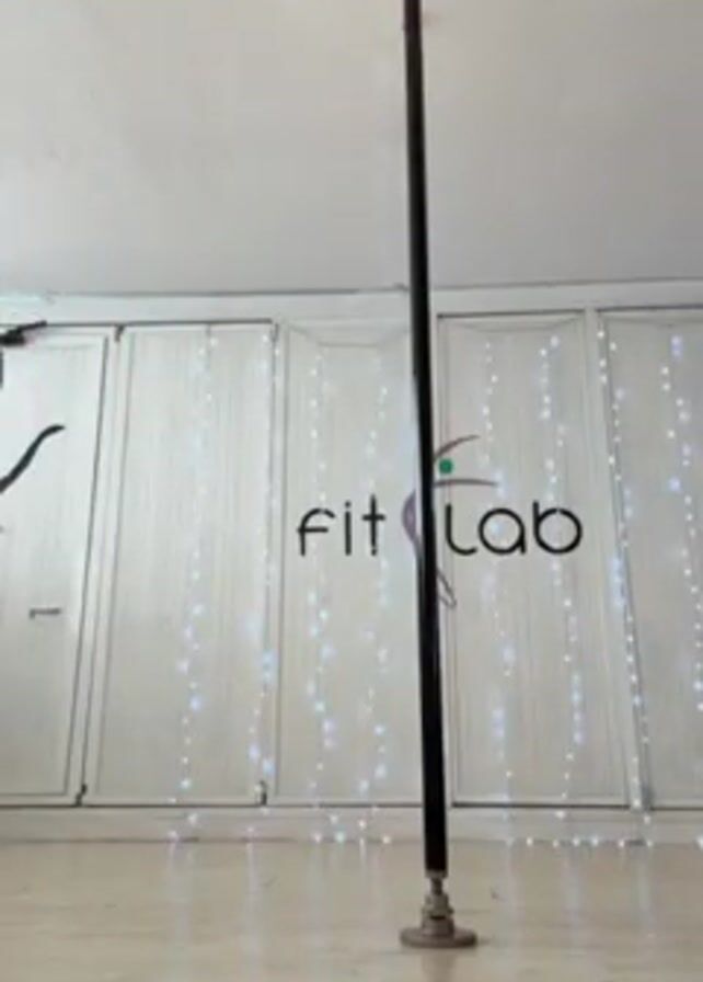 A woman performs pole dancing in a studio with a pole labeled "fitLab