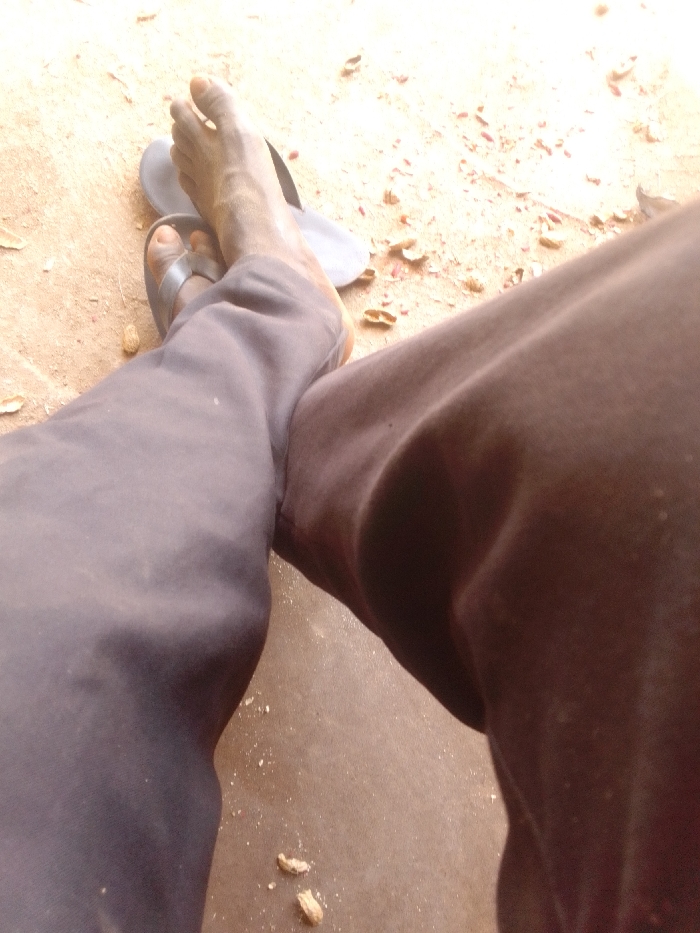The image displays a downward, close-up perspective of a person's legs and feet on a light brown, dusty ground. The location is specified as the city of 0801712591, Nigeria. One individual's legs are visible, covered by trousers. The left leg wears dark grey trousers, and the right leg wears dark brown trousers. The left foot is shod in a dark grey flip-flop. The right foot is bare, resting on a single, unused dark grey flip-flop. Both visible feet appear dusty. The ground surface is scattered with numerous small, irregular light brown and reddish-brown fragments consistent with peanut shells. The posture suggests the person is seated or reclining. No other individuals or interactions are depicted.