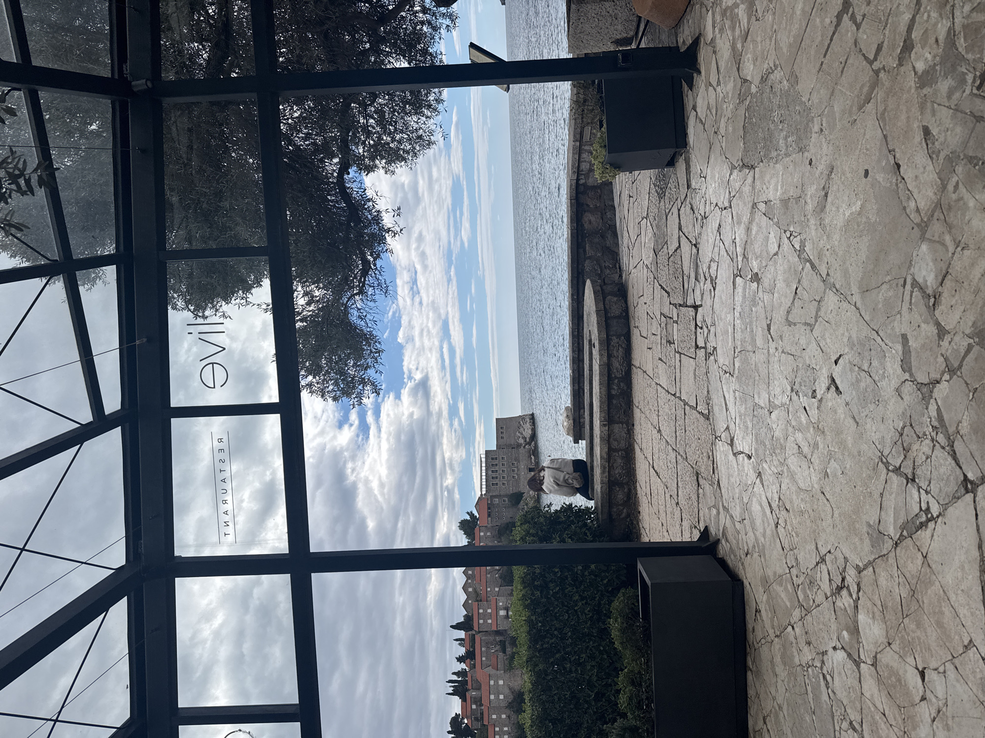 view of Sveti Stefan, Montenegro, framed by the structure of a glass-enclosed restaurant, likely named "Olive Restaurant." The foreground shows part of the restaurant's architectural structure with black metal framing. Outside the restaurant, the view includes a stone walkway and a low stone wall. Beyond the wall, there's the Adriatic Sea under a sky with scattered clouds. In the midground, there is a person sitting on the stone wall. In the distance, there are buildings with red-tiled roofs and some greenery.