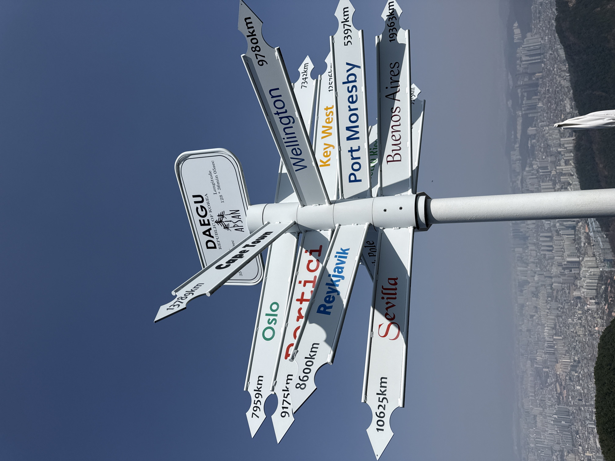 A white, multi-directional signpost stands on Apsan Mountain in Daegu, Republic of Korea, at longitude 128° 36min 05sec. The signpost features a central vertical pole from which multiple horizontal, arrow-shaped signs extend, pointing towards various global cities with their respective distances. Visible destinations and distances include: Cape Town (13789km), Oslo (7959km), Portici (9175km), Reykjavik (8600km), Sevilla (10625km), Wellington (9780km), Key West (12576km), Port Moresby (5397km), and Buenos Aires (19363km). The sky above is clear and blue. Below the signpost, a vast urban panorama of Daegu city stretches into the distance, characterized by numerous high-rise buildings and residential structures appearing hazy against the horizon. Green foliage is visible on the mountainside in the immediate foreground, and a portion of a white fabric object is visible near the bottom right of the frame. No individuals are present in the scene.