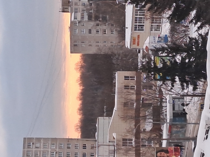 An urban landscape is captured with rows of buildings against a backdrop of an overcast sky transitioning to an orange hue, presumably indicating sunrise or sunset. Trees create a line of separation between the buildings and sky. The perspective suggests a street scene, with glimpses of snow-covered areas. The image is oriented vertically.