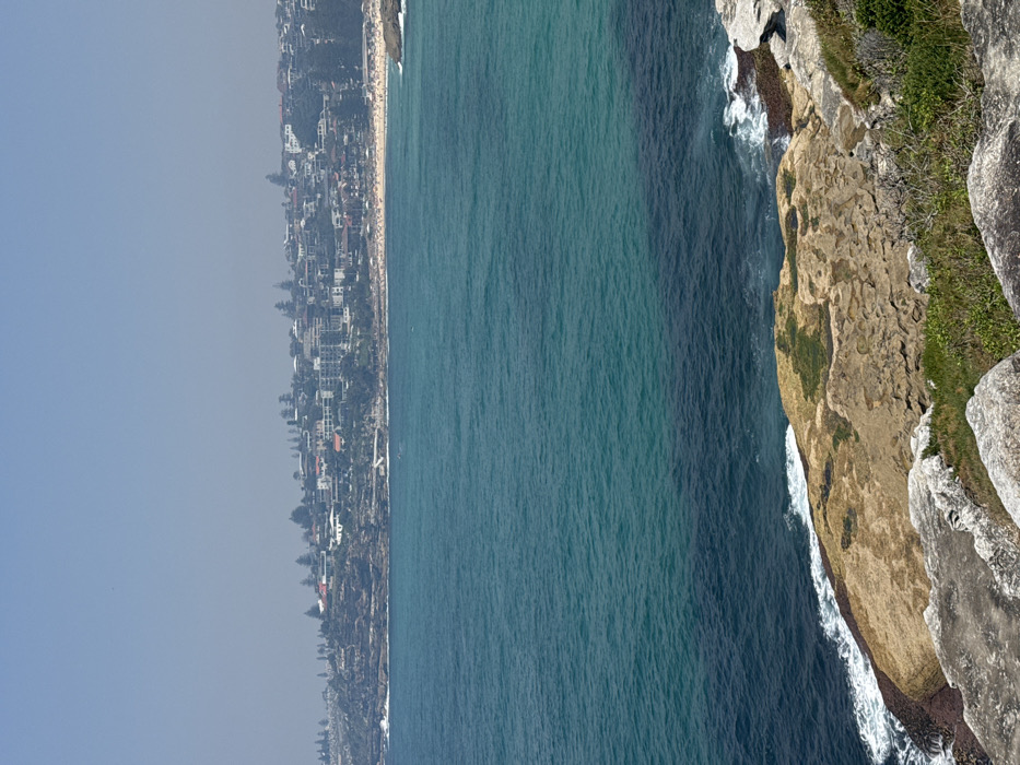 An aerial view depicts a coastline with buildings nestled along the shore, juxtaposed with a vast expanse of blue ocean. The water transitions from a lighter turquoise to a deeper indigo. Rocky cliffs covered in vegetation rise sharply, where white waves crash at the base. The sky is a hazy pale blue, creating a serene yet dramatic coastal landscape.