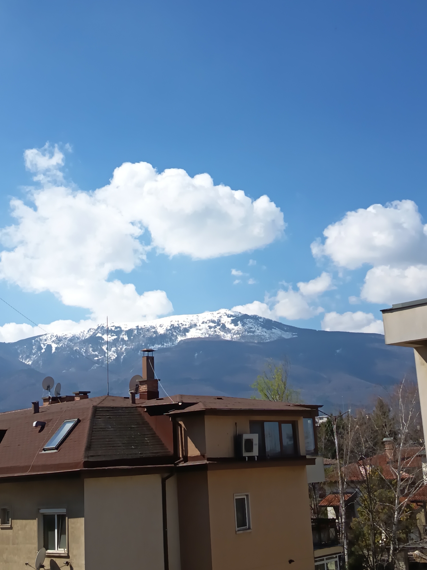 n urban scene in Sofia, Bulgaria. A multi-story building with a brown roof dominates the foreground. The building features chimneys, satellite dishes, a skylight, and an enclosed balcony with an air conditioning unit. In the background, a mountain range with snow-capped peaks is visible under a blue sky dotted with fluffy white clouds. Bare trees and other buildings are interspersed around the main structure.