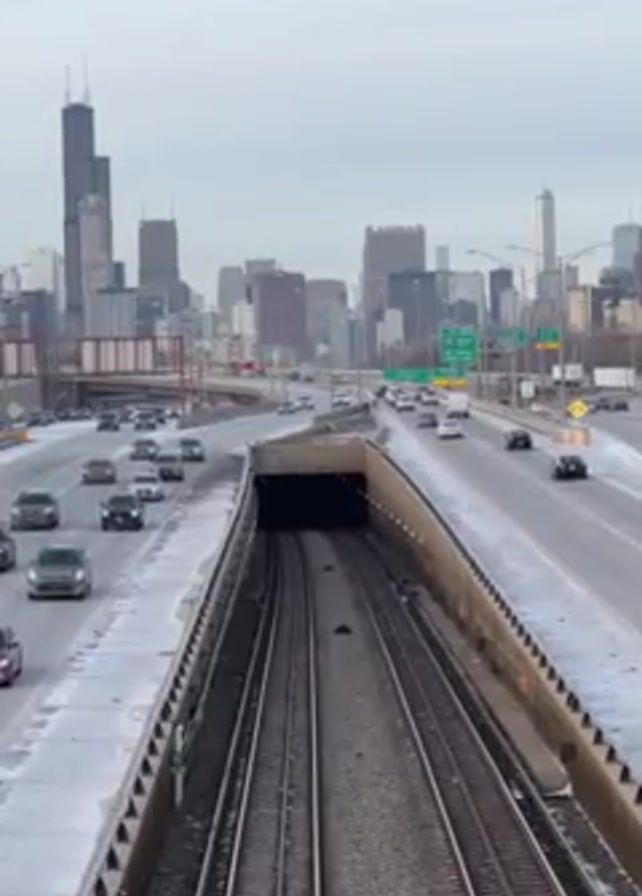 wide shot of a multi-lane highway with the Chicago skyline in the background. The highway is divided by a railway line sunken below street level, leading into a dark tunnel. Cars are moving in both directions on the highway. The scene appears to be taken during winter, with snow visible on the highway's shoulder. The sky is overcast.