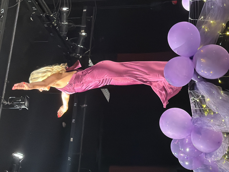 The scene depicts a female individual on an illuminated stage within a performance venue, likely located in Palos Verdes Estates, United States. The individual, with blonde hair, fair skin, and red nail polish, is captured in profile, facing left, with her arms raised and outstretched to her sides, palms open, suggesting a pose or a dance movement. She wears a floor-length, magenta-colored, sleeveless dress made of a satin-like fabric, featuring a low back and a bow detail on the left shoulder strap. Her lower body is partially obscured by decorative elements in the foreground. These elements consist of numerous light purple balloons clustered on an elevated surface, draped with light purple sheer fabric (possibly organza or tulle) and interwoven with warm-toned string lights. The background is dark, revealing various stage lighting fixtures, including spotlights, and what appears to be metal rigging or truss structures. Faint numerical markings, such as "77," "79," and "78," are visible on a structure behind the performer. The lighting is focused on the individual and the foreground decorations, creating a theatrical ambiance. No other individuals or interactions are visible.