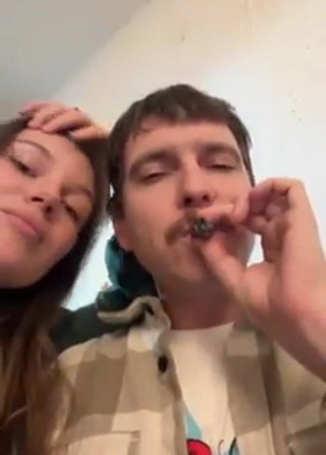 A low-angle selfie-style video shows a woman and a man indoors. The woman is on the left with long brown hair and wears a dark green jacket. The man is on the right with short brown hair and a mustache, wearing a white t-shirt with a cartoon image and a plaid jacket over it. He is smoking a hand-rolled cigarette or joint and exhaling smoke towards the camera. The woman makes a face, scrunching up her nose and puckering her lips. There is indistinct background audio, and a third person's hooded head is briefly visible between the woman and the man. The background is a plain white wall.
