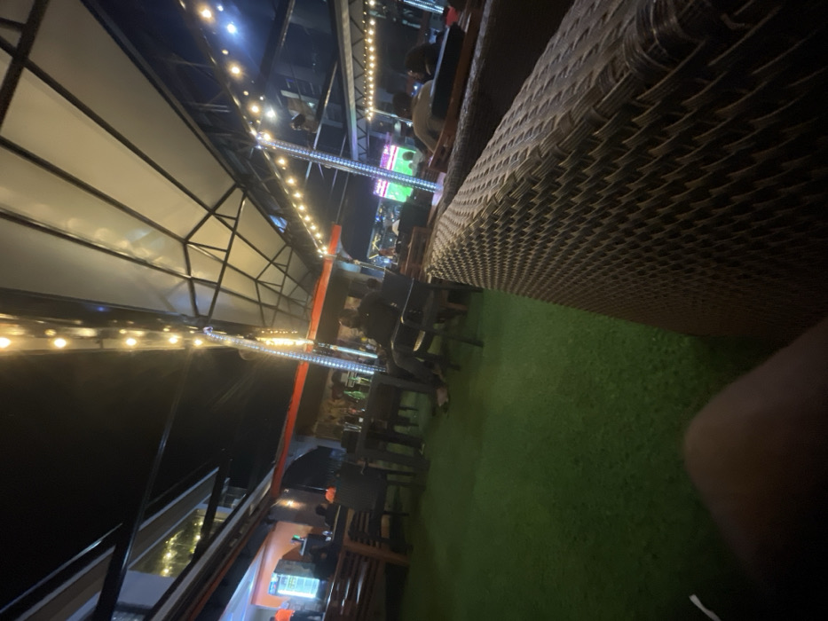 An outdoor seating area is illuminated by string lights under a high, white roof. People sit at tables and watch a screen displaying a sports game. The ground is covered with green turf. The textured surface of a wicker or rattan couch takes up the right side of the frame, partially obscuring the view. The scene appears to be at night with a low light level.
