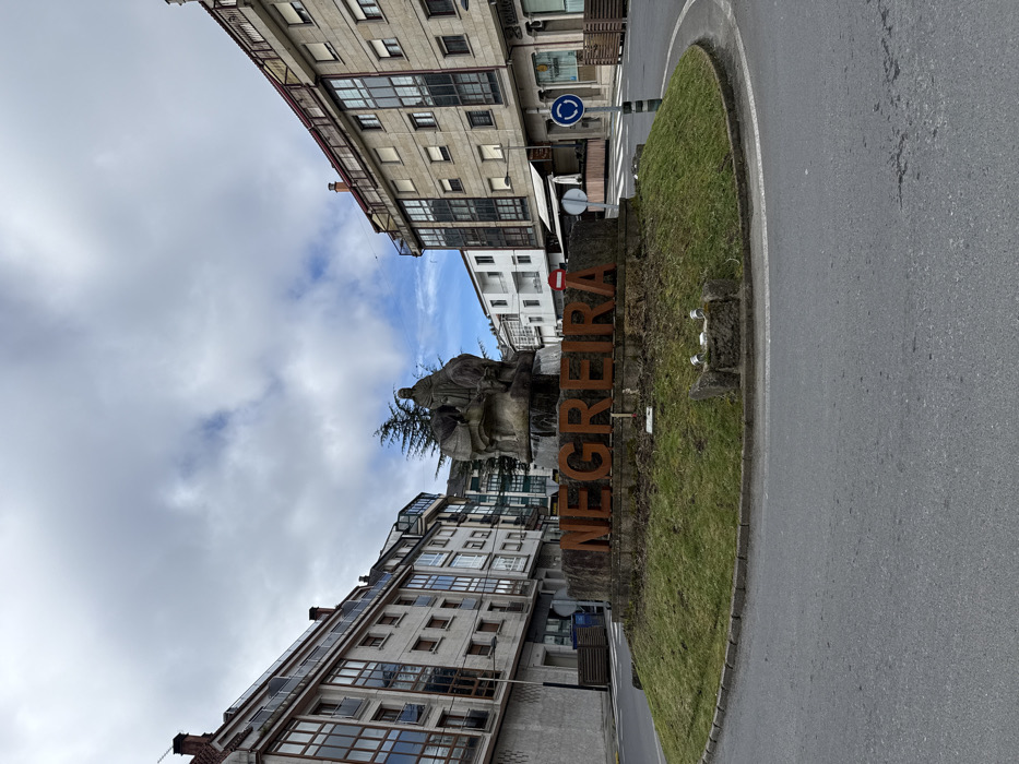 The image depicts a street-level view of a roundabout located in Negreira, Spain, under a partially cloudy sky