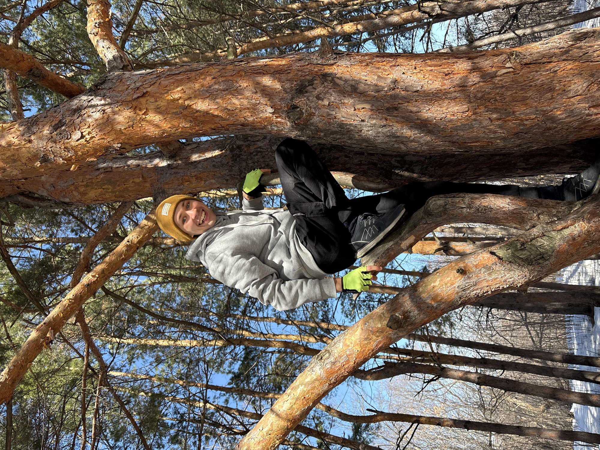 A person is lying horizontally on a large tree branch in a forest. The person is wearing a grey hoodie, black pants, black shoes, a mustard-colored beanie, and bright green gloves. The person is smiling and appears to be relaxed. The tree branch is thick and textured. The background is a blue sky with other tree branches and some snow on the ground. There is no explicit information to confirm that the location is in the city of Ulyanovsk, Russia.