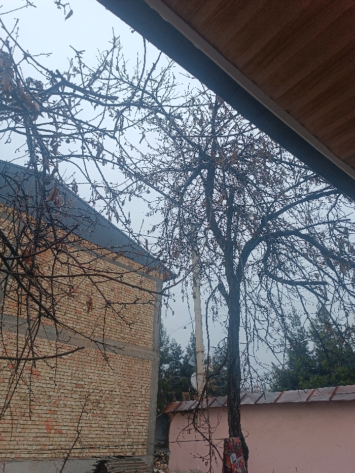 The scene depicts an outdoor environment in Tashkent, Uzbekistan, under an overcast sky, suggesting late autumn or winter. In the upper right, a section of a light brown panelled ceiling with a dark structural beam is visible. The left side features a portion of a multi-story building constructed from light orange-yellow bricks with gray mortar, showing concrete horizontal bands and a dark gray sloped roof. A large, leafless deciduous tree with dark bark and numerous bare branches, some retaining dried leaves, occupies the center. A light-colored utility pole stands behind the tree on the left. In the lower right, behind the tree, a light pink wall or small structure with a dark reddish-brown corrugated metal roof is present. A dense line of dark green evergreen trees forms the distant background beneath the uniform light gray sky. No individuals, actions, or interactions are visible.