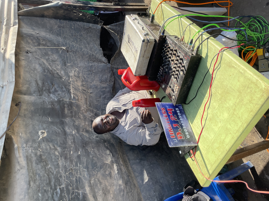 An outdoor scene in Jos, Nigeria, depicts a dark-skinned adult male seated behind a light-green rectangular table, smiling broadly towards the camera. He wears a light-colored, long-sleeved shirt, with his right hand slightly raised. On the table, from left to right, is a black laptop displaying a blue and red sign that reads "LIMITLESS DJ 24" with the phone number "08034585083". To the right of the laptop is a black, multi-channel audio mixer, heavily used and connected by multiple colored cables (green, blue, black, orange, red) that extend to the floor. Behind the mixer, an aluminum-colored case labeled "SILVER AUDIO" is stacked on top of a black audio component. Two red plastic water bottles and a red plastic jerrycan are also on the table behind the equipment. The background features a weathered, dark grey, textured tarpaulin or metal sheet acting as a makeshift wall, showing signs of wear and tear, with a corrugated metal roof visible above. The ground is unpaved and dusty. The scene is illuminated by direct sunlight, casting strong shadows from the table and equipment. A blue plastic chair is partially visible on the far left.