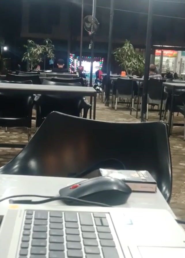 view from a cafe table at night. A laptop sits on the table, with a mouse next to it. Several empty tables and black chairs are visible in the background, stretching into the distance. Beyond the tables, the facade of a building is decorated with bright, colorful lights. A small potted plant sits on a table further away. A rotating fan is mounted on a pole. The ground is a light-colored, uneven surface. There are voices in the background.