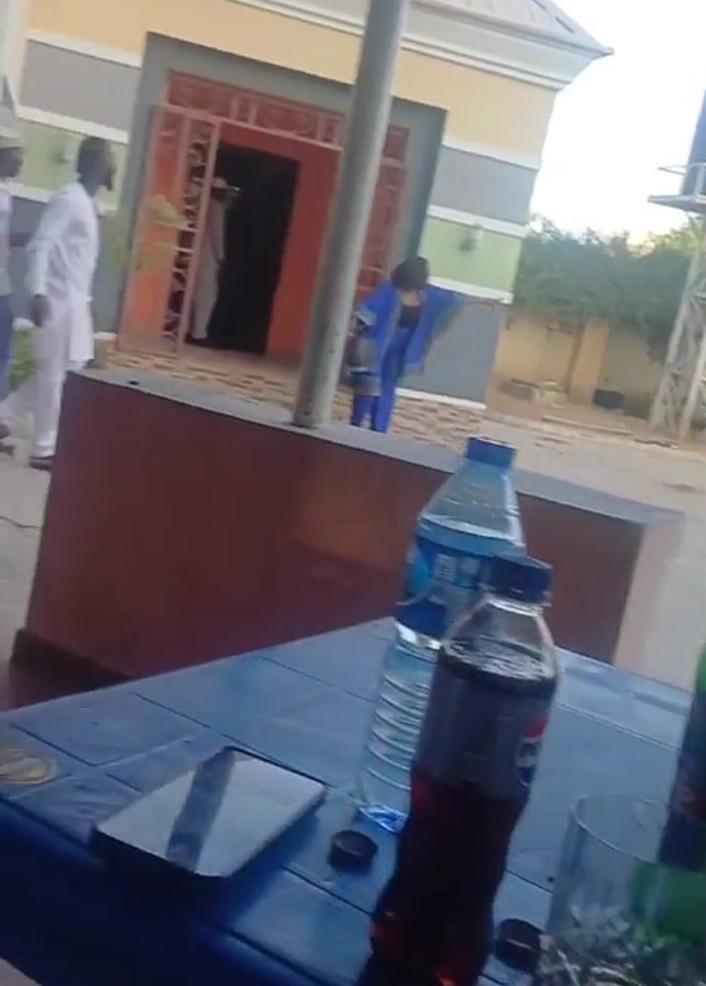 n outdoor scene at what appears to be a restaurant or gathering place. There's a blue plastic table in the foreground with a bottle of Pepsi, a bottle of water, a glass, a green beer bottle, a brown beer bottle, and two smartphones. The background shows a building with light-colored walls and dark red trim, a water tower structure, and some greenery. People are moving in and out of the building. One woman is wearing a blue blazer. Two men are wearing white outfits. A man is wearing a hat. Music is audible.