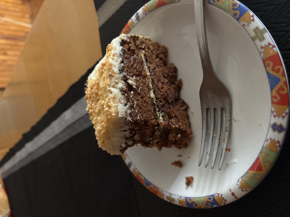 - "An indoor scene in the city of Stefan Karadja, Bulgaria, presents a partially consumed slice of multi-layered cake on a decorative white ceramic plate" by FM-kr1G73, licensed under CC BY 4.0
