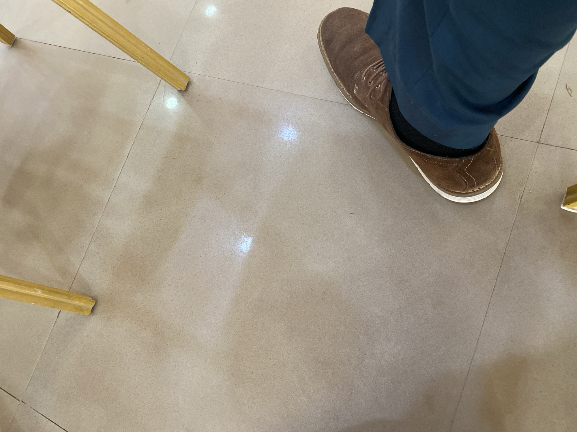 The scene depicts a portion of tiled flooring, likely indoors, with a person's foot visible wearing a brown suede-like shoe, dark sock, and dark blue trousers