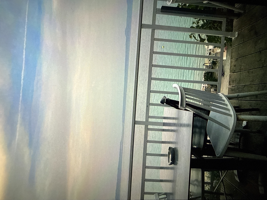The image depicts an outdoor seating area, located in Cherven Bryag, Bulgaria, offering a view of a vast body of water under a partially cloudy sky. In the foreground, a dark, rectangular table is positioned on a weathered wooden deck. A grey, circular ashtray rests on the table's surface. Two chairs are visible; one is a light-colored, slat-backed chair in the lower center, and another darker chair is partially seen behind it. A white railing, composed of horizontal and vertical bars, spans the width of the image, separating the deck from the water. The water below the railing is a turquoise-green color with subtle surface ripples. A single yellow buoy is visible floating in the upper right portion of the water. Below the railing and closer to the water, indistinct structures and green vegetation are discernible. The distant horizon reveals a faint strip of land or hills. The sky above features a mix of light blue and pale beige clouds, with two distinct white contrails stretching horizontally. No individuals are present, and no actions or interactions are depicted.