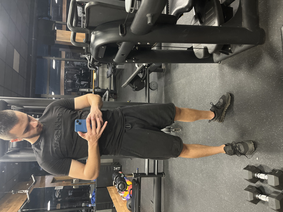 The scene depicts the interior of a fitness center or gym in the city of Unknown, Unknown. One adult male stands centrally, facing slightly away from the camera, with his head bowed, looking down at a light blue smartphone held in both hands at chest level. He is wearing a black short-sleeved t-shirt with a dark embossed "adidas" logo, black athletic shorts with a visible drawstring, and dark athletic shoes. In the lower-left foreground, two sets of dark hexagonal dumbbells rest on the black rubberized floor. To the male's right, a dark-colored weight machine is partially visible, featuring black padding and metal components. To his left, a rack holding several colored kettlebells (red, yellow, and blue) is partially visible. The background features large windows reflecting additional gym equipment, alongside other dark-colored exercise machines and benches within the facility. The environment is an indoor space with artificial lighting, a dark floor, and dark walls/fixtures.