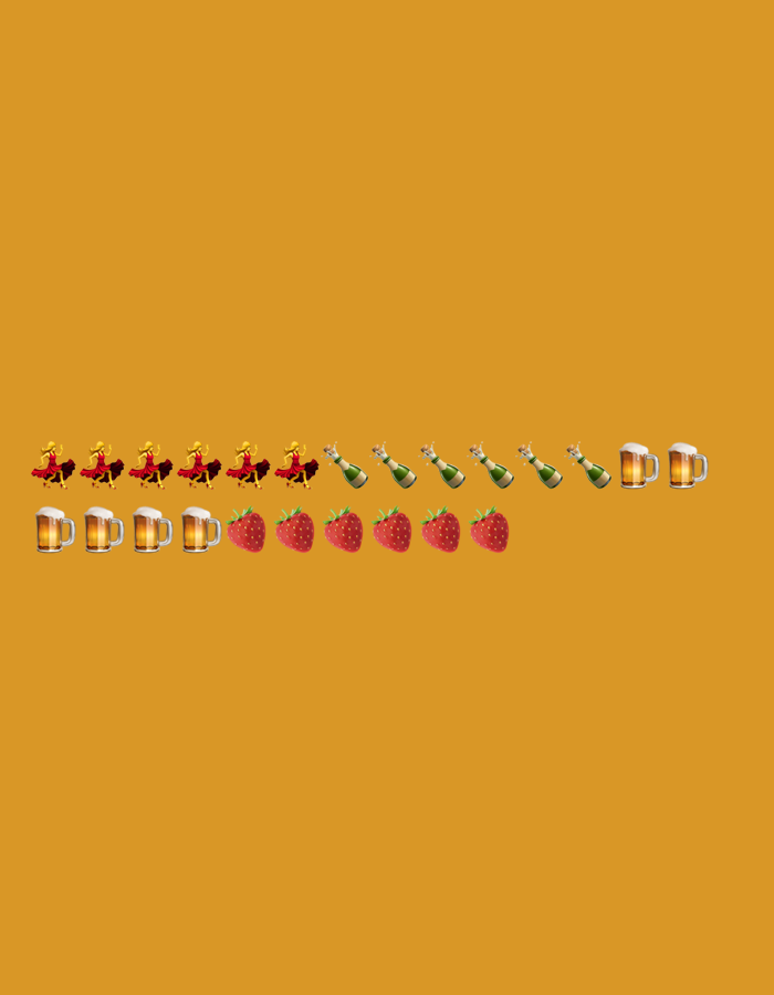 row of emojis against an orange background. From left to right, the emojis include five women in flamenco dresses, four mugs of beer, five strawberries, four champagne bottles, and two more mugs of beer. The location is not discernible, and the subjects are emojis. There are no discernible actions or interactions. The environment is a plain orange background.