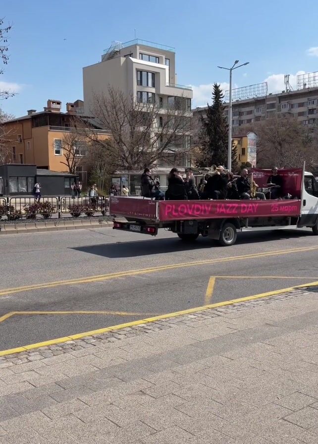 The video captures a live jazz band performing on the back of a moving flatbed truck in an urban environment. The truck, painted in a vibrant shade of pink, prominently displays the words "PLOVDIV JAZZ DAY 25 mapm." Several musicians are visible on the truck's bed, playing instruments such as saxophones and trumpets. They are all dressed in dark attire. The truck is traveling along a city street, marked with yellow lane dividers and pedestrian crosswalks. On the sidewalks along the street, pedestrians can be seen walking. To the left of the truck, a white Volkswagen Golf drives parallel to the truck and a police car then follows the car. In the background, a variety of buildings are visible, including modern apartment complexes and commercial structures. The sky is blue, with a few scattered clouds. The weather appears to be pleasant and sunny.