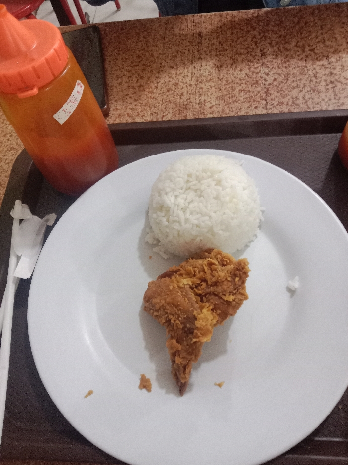 A close-up, high-angle shot depicts a meal served on a dark brown tray within an indoor dining establishment in Kaliwungu, Indonesia. A white oval plate dominates the lower half of the frame, holding a dome-shaped portion of white rice on the left and a piece of golden-brown, breaded fried chicken on the right. Small crumbs of food are visible on the plate's surface. To the upper left of the plate, an orange plastic squeeze bottle, containing a reddish-orange liquid consistent with chili sauce, stands upright. A white paper wrapper or napkin encloses a set of white plastic cutlery (likely a spoon and fork) to the left of the plate. The tray rests on a light brown, textured tabletop. In the background, out of focus, portions of a red chair and a person's leg clad in blue denim are discernible.