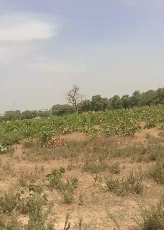 field with rows of green plants under a partly cloudy sky. The ground is mostly dry and brown with patches of weeds. In the distance, there is a line of trees and possibly some buildings. The overall impression is of a rural agricultural scene on a sunny day.