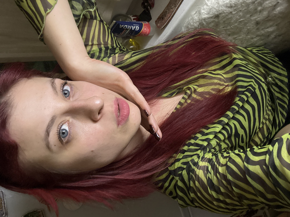A woman with red hair and striking blue eyes is posing for a selfie