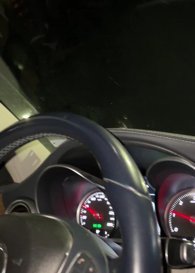 A camera situated inside a car, focusing on the dashboard, captures a car driving in a tunnel at night