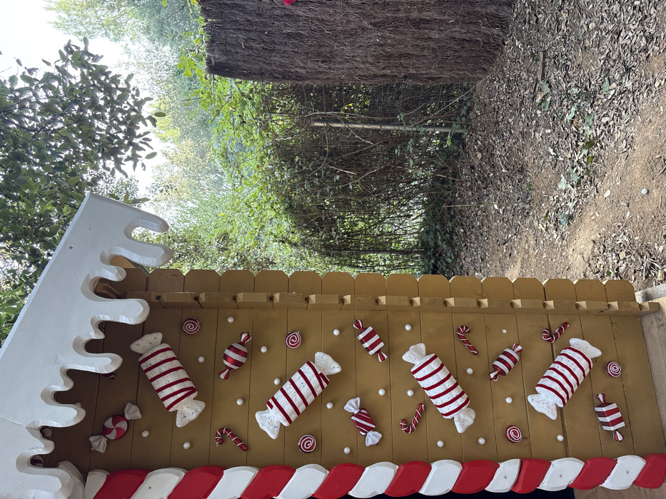 An outdoor scene in Castellar del Vallès, Spain, features the right side of a decorative, gingerbread house-themed structure dominating the left foreground