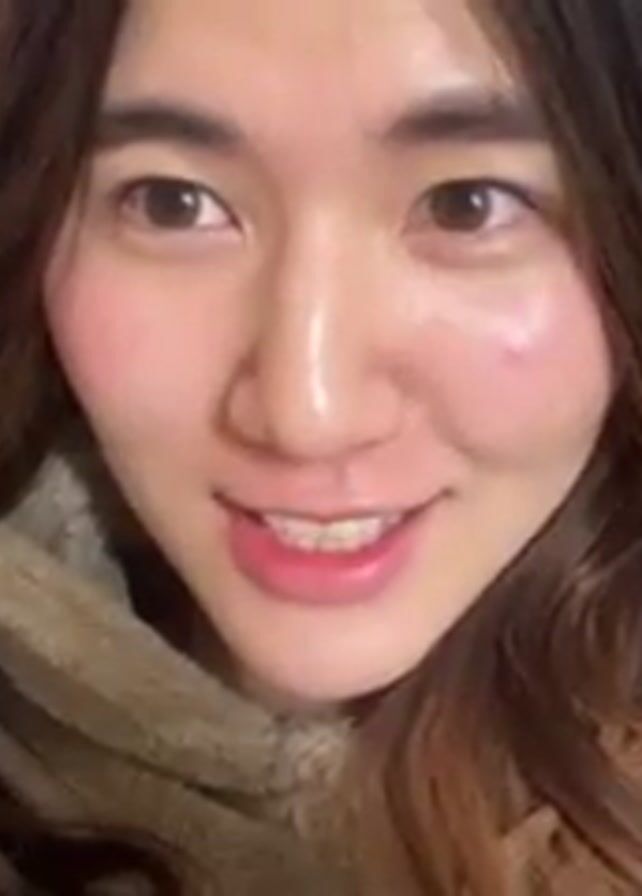 A young woman with long, wavy, brown hair is lying down on a bed with pink and white patterned sheets. She is wearing a tan fleece hoodie and looking directly at the camera. She is singing, "Last Christmas, I gave you my heart." She smiles and makes a slight pained expression at different points. The lighting is bright.