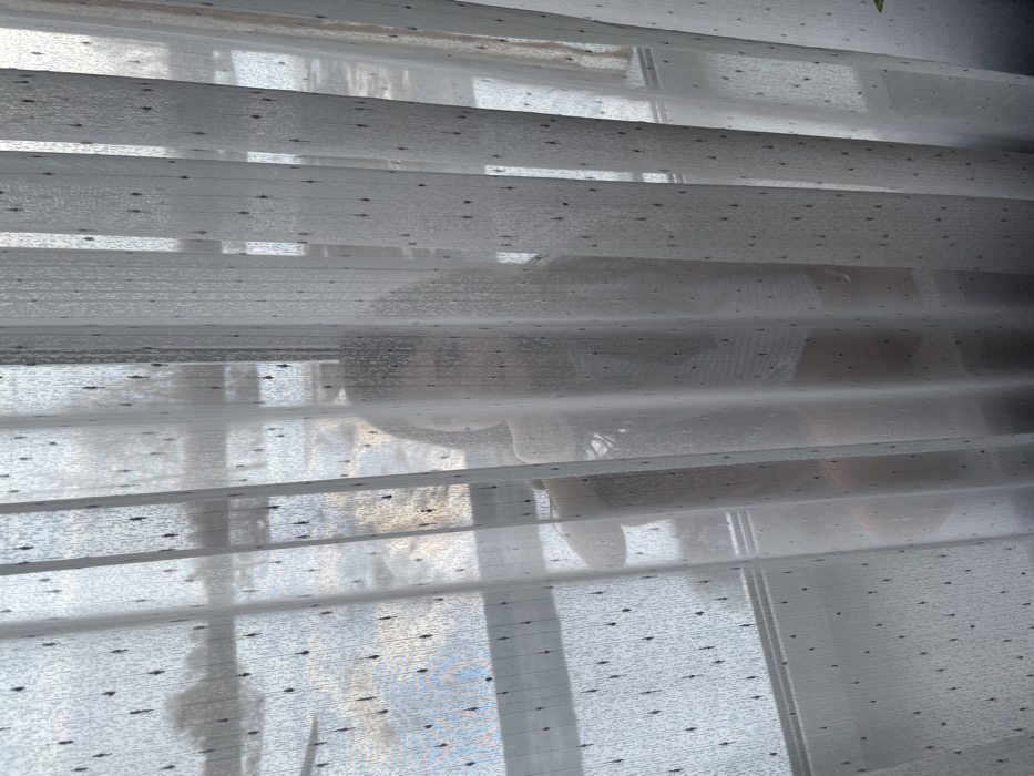 An image taken from an interior perspective in Nizhnii Bugrysh, Russia, depicts a partially obscured individual positioned behind translucent, light-colored curtains
