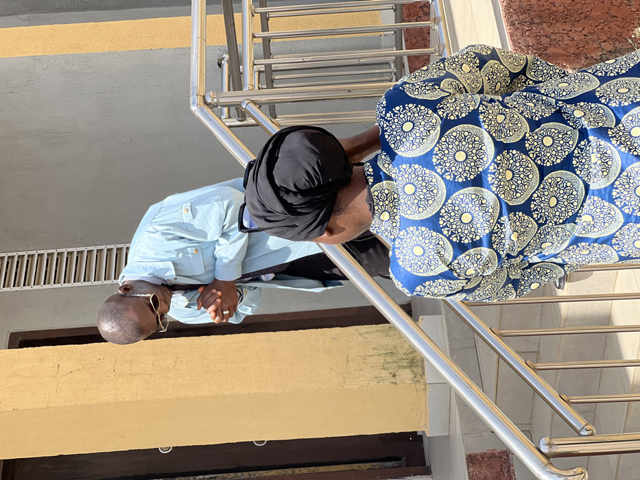 The scene depicts two individuals outdoors in Jos, Nigeria, during daylight hours under bright sunlight. A bald male subject, positioned on a set of light-colored steps, is observed from a slightly elevated angle. He wears gold-rimmed sunglasses, a light blue collared jacket with two chest pockets, a dark shirt with a tie, and dark trousers. His head is bowed, and his hands are clasped together at waist level. A ring is visible on the fourth finger of his left hand. A female subject, seen from behind, occupies the foreground. She wears a black headwrap, with dark sunglasses resting atop it. Her upper body is covered by a long-sleeved garment featuring a dark blue background with a repeating pattern of light yellow/cream concentric circles. She is positioned near a shiny, silver-colored metal handrail with vertical balusters, which extends diagonally across the frame from lower-left to mid-right. The background consists of architectural elements: a prominent yellow/ochre-colored pillar or wall section with visible cracking and green discoloration on the left, next to a dark brown door frame. Beyond the man, a light grey wall is visible, featuring a white, ladder-like structure or ventilation grille. The bright lighting suggests an unclouded sky, casting sharp shadows.