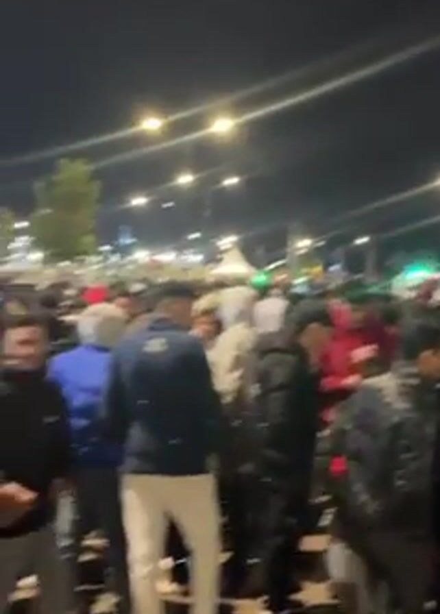 A large crowd of people is gathered in an open outdoor space at night. The majority of individuals appear to be young males, dressed in casual clothing such as jackets, hoodies, and hats. The crowd is dense, with people standing close to one another. Overhead streetlights illuminate the area, creating a bright, artificial ambiance. In the background, there are tents and other structures, which might suggest a public event or gathering. The overall atmosphere suggests a festive or celebratory occasion, or perhaps a large-scale public meeting.