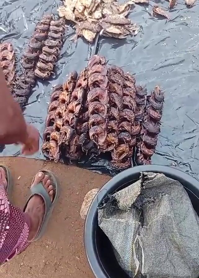 street vendor selling dried fish. The fish are displayed on a black tarp and in a woven basket. Some of the fish are strung together on skewers. A person wearing sandals and a patterned cloth stands near the fish. The ground is dirt and littered with pieces of paper. A black plastic tub covered with a gray sack sits near the vendor.