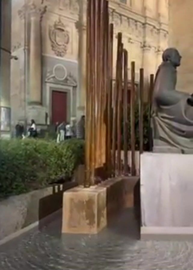 At night, a public square features a modern water feature with vertical metal pipes and a sculpture of a seated man