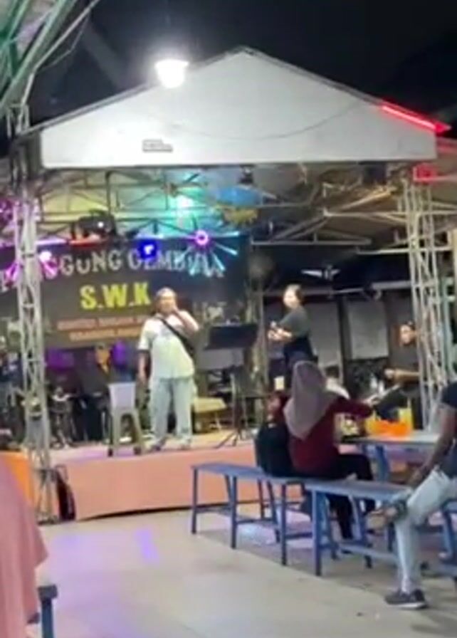 stage with two people speaking in front of a seated audience. The stage is simple, built from scaffolding and covered with a white tent-like roof. A black banner with the words "Panggung Gembira S.W.K" hangs at the back of the stage. The two individuals on stage are using microphones, suggesting a performance or presentation. The audience is seated at blue picnic tables, and many are dressed in casual attire. The environment seems to be an outdoor or semi-outdoor venue at night, with overhead lighting illuminating the scene. People walk in front of the camera, providing different angles of the stage.