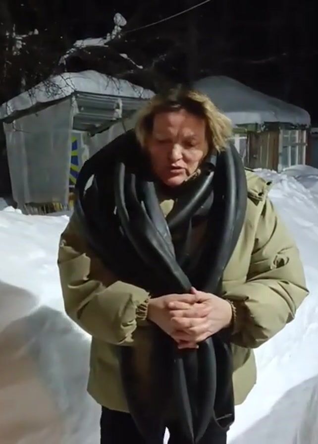 A woman stands outdoors in the snow, wearing a tan jacket. She has a long black tube wrapped around her neck and held in front of her, resembling a large scarf. The background shows a snowy landscape with small buildings covered in snow. The scene appears to be lit artificially, possibly at night. The woman is looking directly at the camera and speaking.