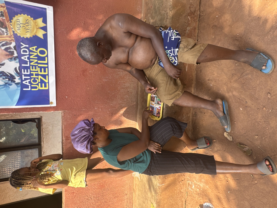The image depicts an outdoor scene in Aguata, Nigeria, in front of a reddish-brown plastered building