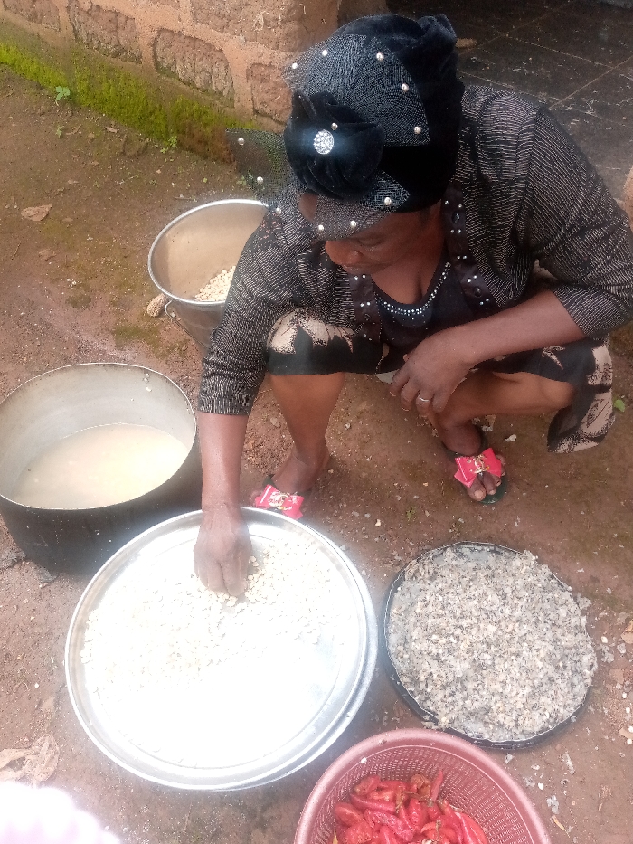 An adult female is observed in a crouched position on reddish-brown earth in Agban, Nigeria, facing downwards. She wears a black headwrap adorned with silver bead-like embellishments and a central rhinestone cluster, a dark, patterned long-sleeved top over a dark undergarment, dark patterned pants, and red sandals with bow detailing. Her right hand manipulates light-colored, granular material within a large, circular metallic tray on the ground. To her immediate left is a dark pot containing a light-colored liquid. Further back, a metallic bucket also holds the light-colored granular material. To her right, a dark circular pan contains grayish-white granular material. Partially visible in the lower foreground is a brown plastic basket holding numerous red, elongated produce items. A reddish-brown brick or stone wall, partially covered in green moss, forms the background.