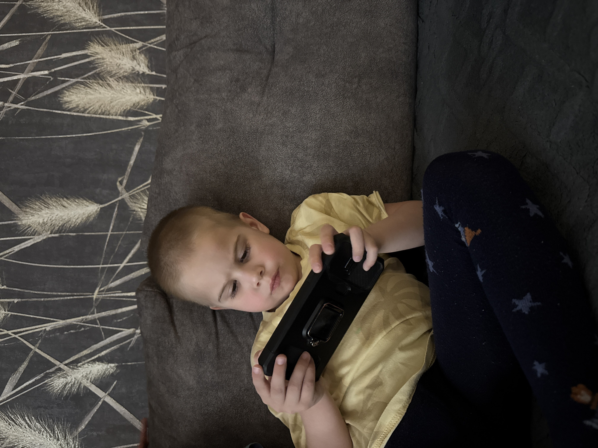 - "A child is lying on a grey couch, holding a black smartphone in both hands" by FM-Y3efA2, licensed under CC BY 4.0
