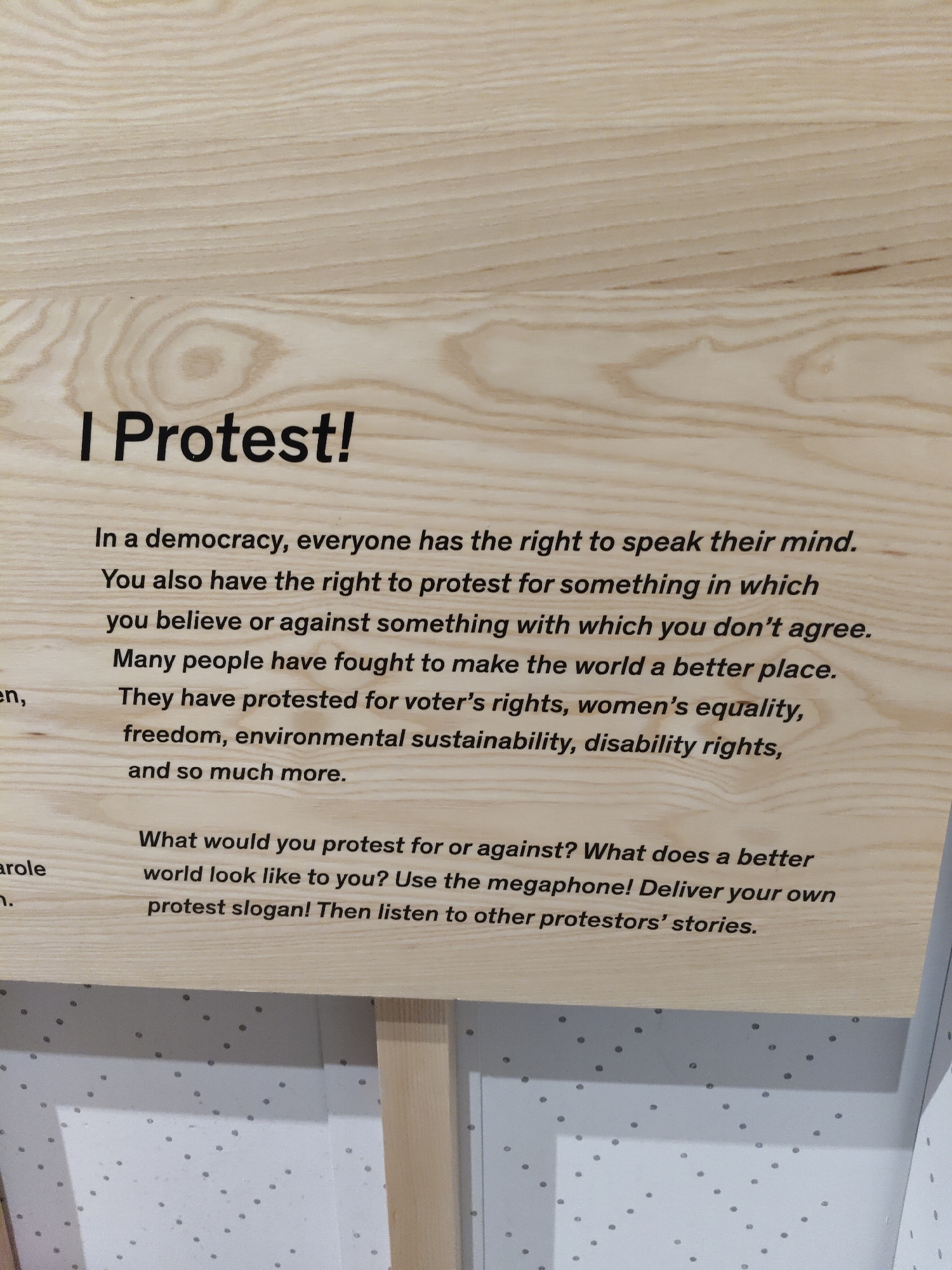 wooden sign titled "I Protest!" The sign states that in a democracy, everyone has the right to speak their mind and protest for or against something they believe in or disagree with. It mentions that many people have fought for a better world, protesting for voter's rights, women's equality, freedom, environmental sustainability, and disability rights. The sign then prompts the viewer to consider what they would protest for or against and what a better world would look like to them, suggesting they use a megaphone to deliver their own protest slogan and listen to others' stories. Below the wooden sign is a wall with a pattern of grey dots on a white background. This is likely part of an exhibit somewhere, but no more information can be gleaned about location.
