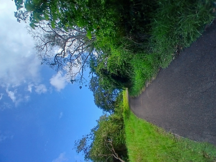 A narrow asphalt road winds into the distance, bordered by lush green grass and dense foliage on both sides. A bright blue sky filled with fluffy white clouds is partially obscured by the branches of trees, some with bare limbs. The perspective is tilted, giving the scene a slightly disorienting effect. The sunlight illuminates the green landscape and creates a vivid contrast against the dark road.
