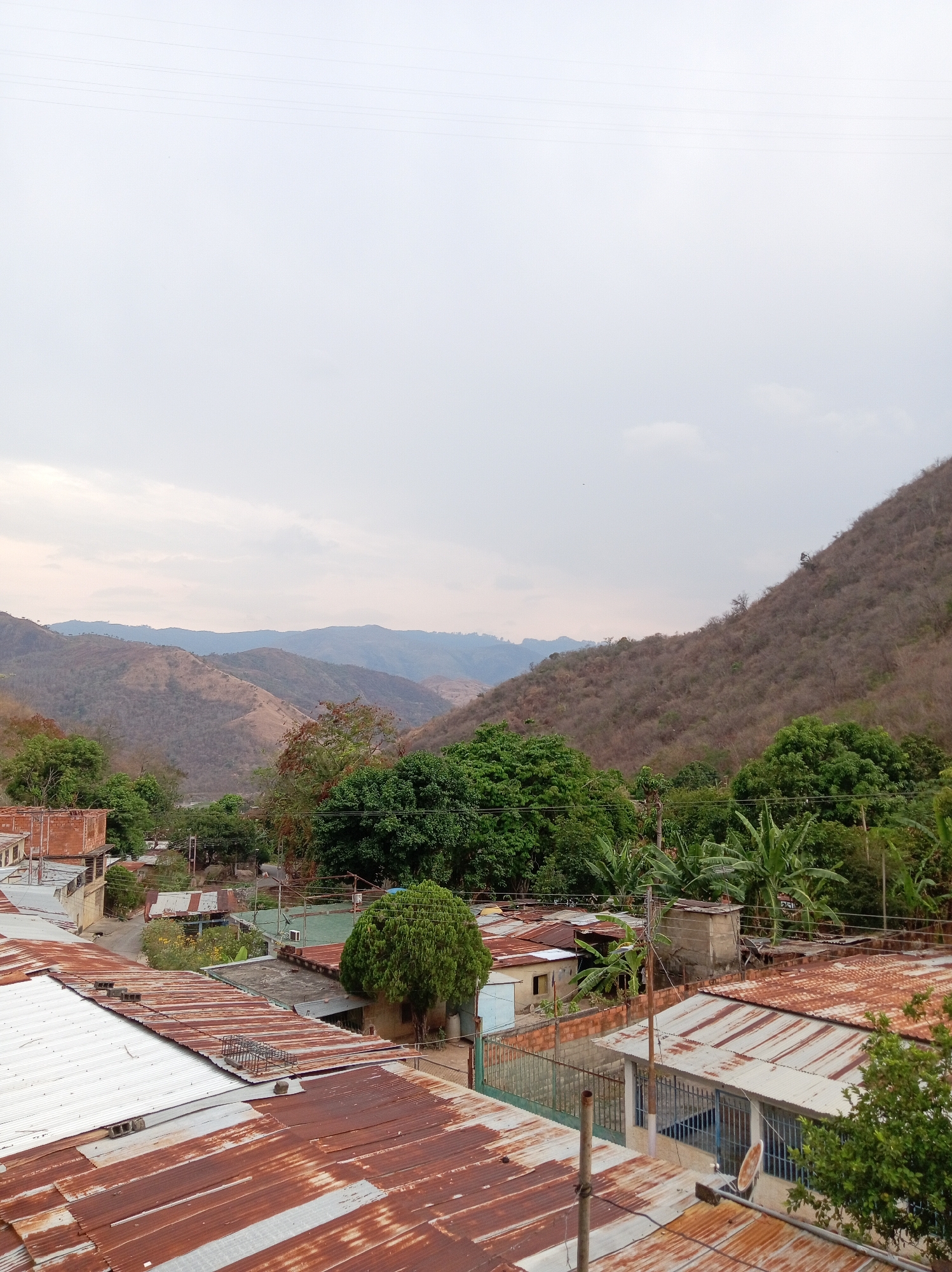 view of Las Tejerías, Venezuela, with a foreground of corrugated metal roofs, many rusted. In the midground, there are green trees, some banana plants, and additional buildings of varying construction. A mountain rises in the background on the right side of the image, with other more distant mountains behind it. The sky is overcast.