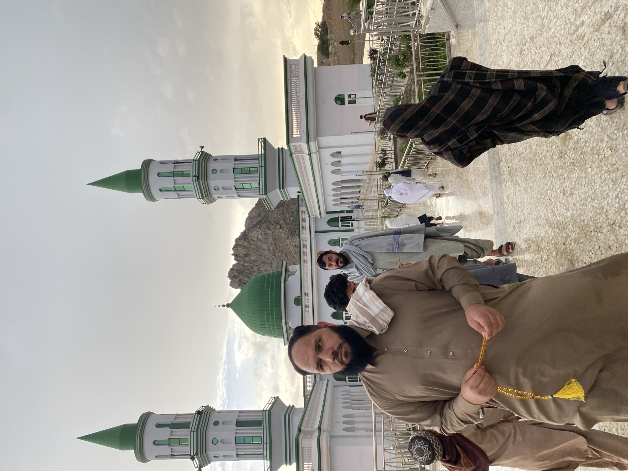 The image depicts an outdoor scene at a mosque complex in Arghandab, Afghanistan, under a cloudy sky. The main structure is a white building with prominent green accents, including two minarets with conical green tops and green-framed windows, and a large central green dome. The building features arched walkways and a flat roofline with a balustrade, and is situated against a backdrop of rocky mountains. The ground is a light-colored paved surface, appearing wet or reflective. In the foreground, a man with a full dark beard and mustache, wearing a light brown traditional shalwar kameez, stands slightly left of center, looking to his left. He holds a strand of yellow prayer beads (tasbih) in his hands. A striped white and brown cloth is draped over his left shoulder. To his immediate left and slightly behind him, a child or shorter individual in a brown garment and a white patterned cap is partially visible. Behind the main man, another man with a beard, dressed in a light grey garment and a grey shawl, walks forward. In the midground, to the right, a person viewed from behind wears a dark, plaid-patterned garment covering their head and body, walking away from the camera in dark sandals. Further back, several other individuals, some in white traditional clothing, are visible walking on the paved surfaces of the complex. The area features metal railings alongside pathways and small planted garden beds with green shrubs.