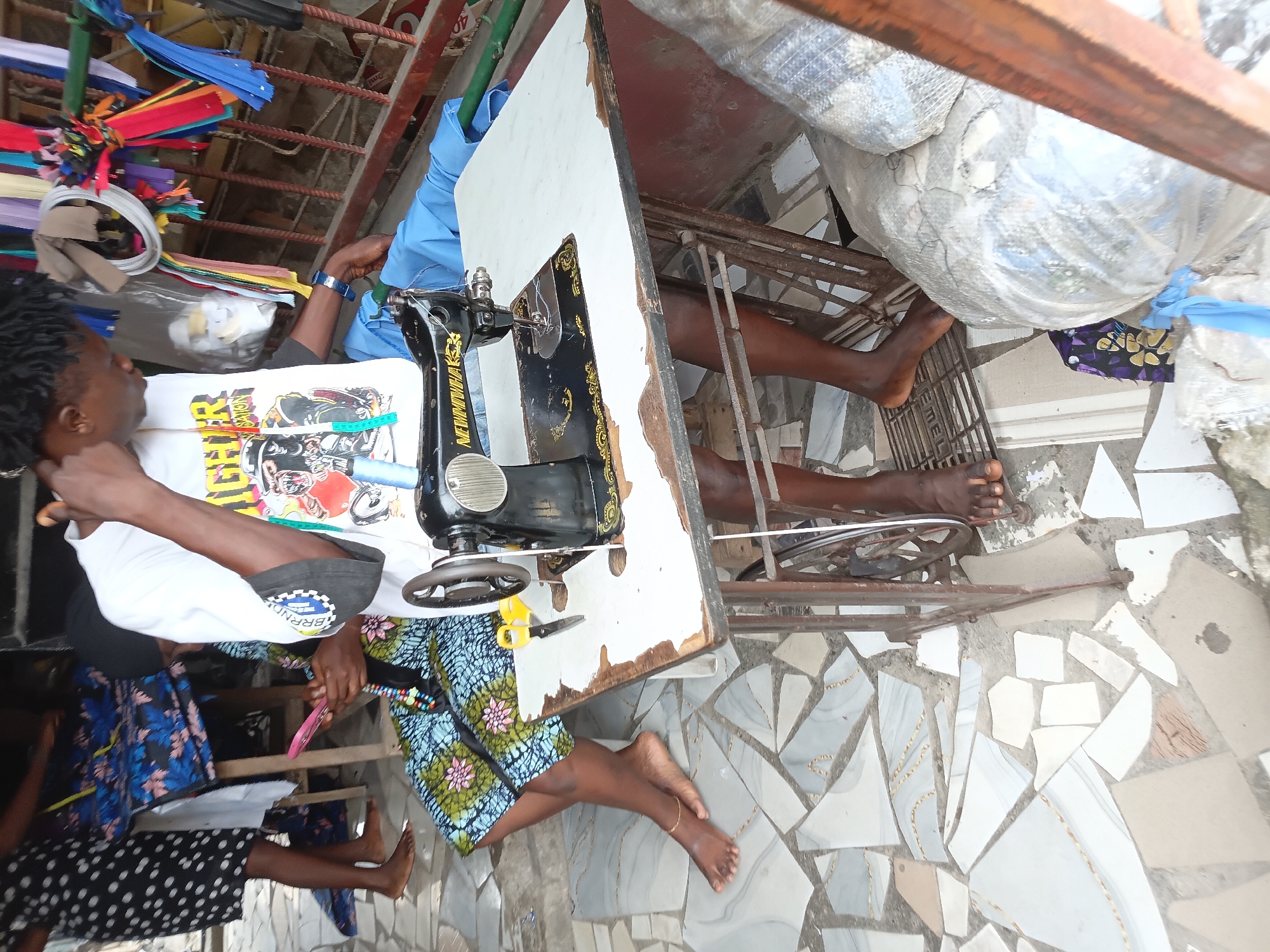 The scene depicts a tailor in Ado, Nigeria, sitting at a vintage, black sewing machine with gold accents, positioned on a white table with worn edges. The tailor is wearing a white t-shirt with a graphic print, seated to the left of the machine, near colorful zippers and various fabric pieces. There are two other people shown: One to the left and one partially hidden underneath the sewing table. The tailor to the left of the machine is wearing a dark skirt with white polka dots and a blue top. The person underneath the table is also wearing a floral pattern skirt. The floor is tiled with broken and mismatched white and grey tiles. A large bag sits near the edge of the table, containing additional fabrics.