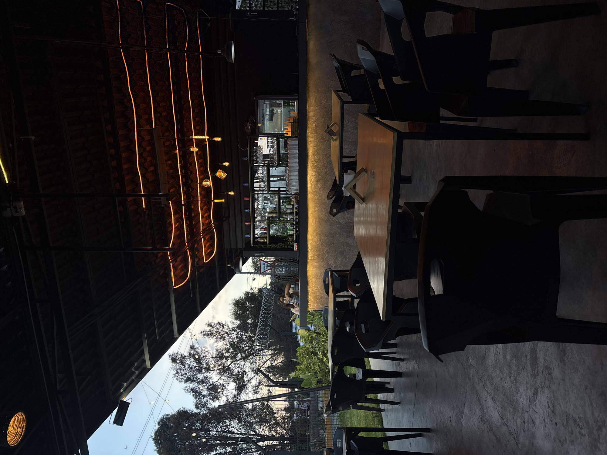 The image depicts a dimly lit outdoor seating area of a restaurant or bar, likely in San Pedro Cholula, Mexico. Rows of black plastic chairs are positioned around square wooden tables. String lights hang above, creating a warm glow. Through an opening, a view of the outside is visible, including trees, a fence, and the sky. In the distance, people are seated at tables outside the fenced in area, and they appear to be engaging in conversation. The scene is captured from a slightly elevated perspective.