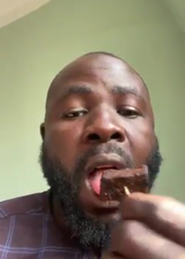 A man with dark skin, a full beard, and a maroon and blue plaid shirt is centered in the frame against a light green wall. He holds a toothpick with a small, dark piece of food on it, and he puts the food into his mouth and chews.