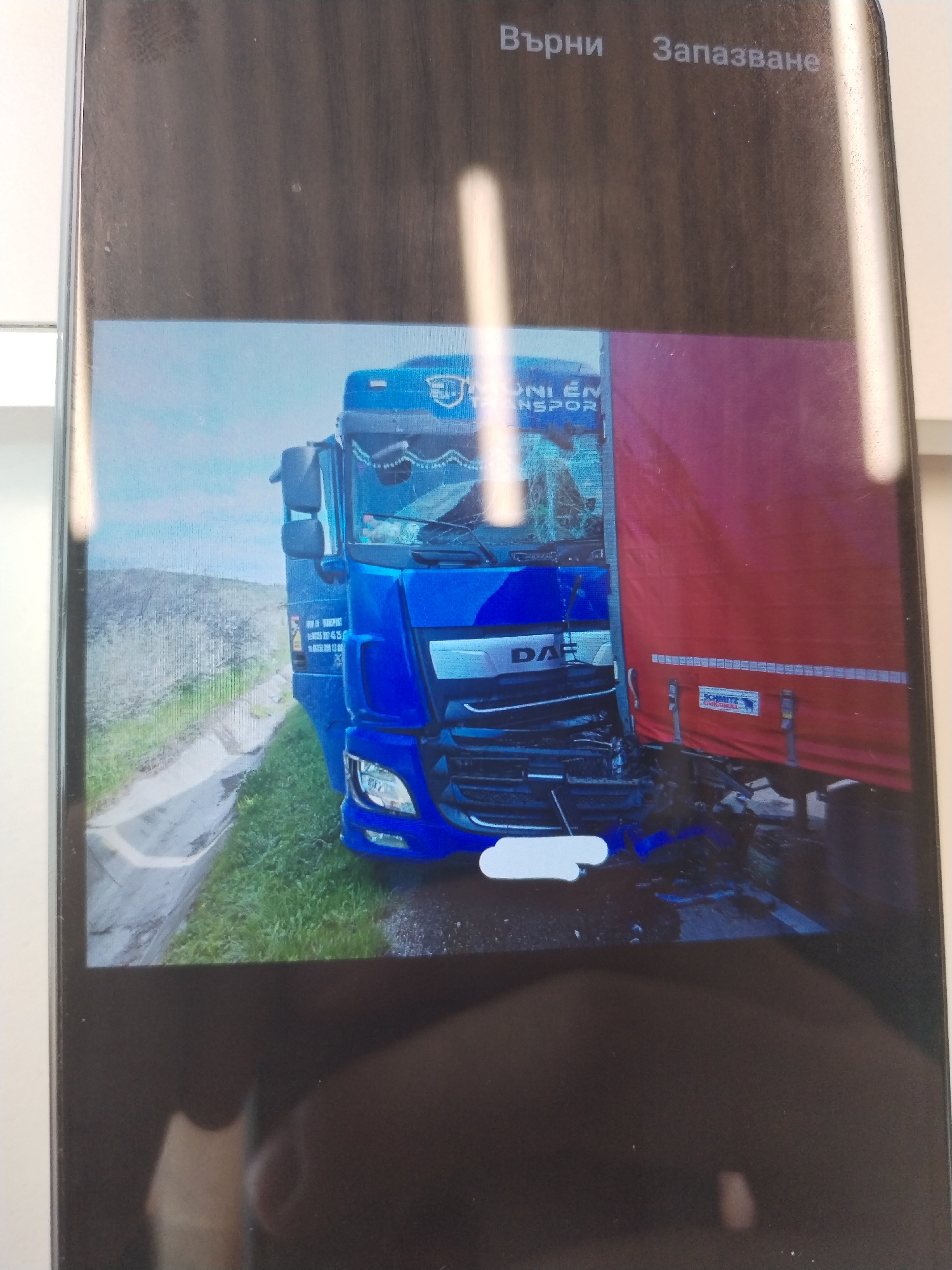The image displays a photograph of a digital screen, showing a roadside collision between two semi-trailer trucks. The location is an unidentifiable rural or semi-rural area, featuring a paved road, a concrete-lined drainage ditch, green grassy verges, and a sloped earth embankment under a clear to partly cloudy sky. In the foreground of the displayed photograph, a blue DAF semi-truck cab is depicted from a frontal-right perspective, exhibiting significant damage. Its front bumper, grill, and lower body panels are crushed and fragmented. The windshield is severely fractured with a spiderweb pattern of cracks. Blue liquid, consistent with coolant or engine fluid, is visible on the ground beneath the damaged front end. Text partially visible on the side of the blue truck indicates "Moni Em Transpor." To the right of the blue truck, a red semi-trailer is present, its side impacted by the blue truck. The trailer bears a "SCHMITZ CARGOBULL" logo on its lower side. The exact extent of damage to the red trailer is partially obscured by the blue truck's position. No individuals are visible in the scene. The digital screen itself shows Bulgarian text at the top: "Върни" (Back) and "Запазване" (Save), with reflections across its surface.